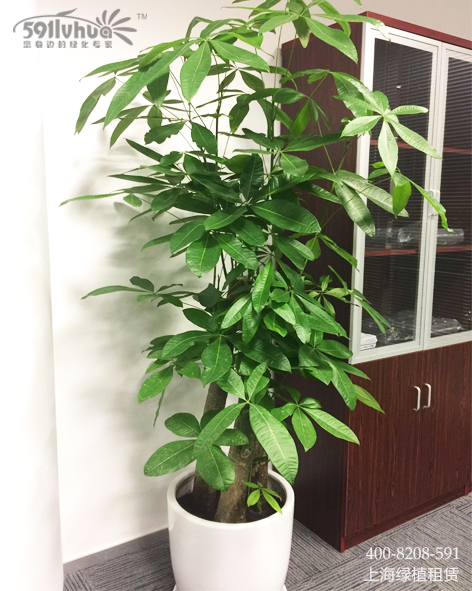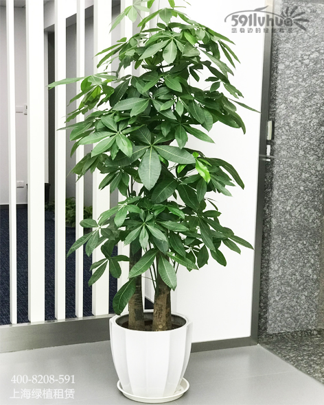 發(fā)財(cái)樹(shù)為常綠喬木,樹(shù)高可達(dá)10米左右。掌狀復(fù)葉互生,葉柄長(zhǎng)10~28厘米;小葉5~9枚,葉長(zhǎng)橢圓形、全緣,葉前端尖,長(zhǎng)約10~22厘米,羽狀脈,小葉柄短?;▎紊谌~腋,有小苞片2~3枚,花朵淡黃色。寓意著“生意興隆,財(cái)源滾滾”。
