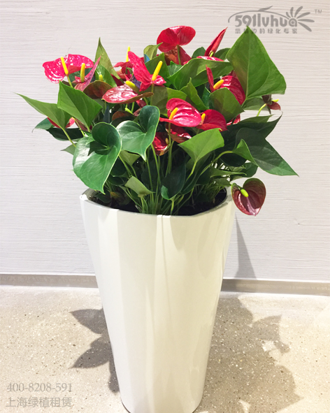 紅掌為多年生常綠草本花卉。性喜溫?zé)岫酀穸峙潘己没T花燭的環(huán)境,怕干旱和強(qiáng)光暴曬。其適宜生長(zhǎng)晝溫為26~32℃,夜溫為21~32℃。具肉質(zhì)根,無(wú)莖,葉從根莖抽出,具長(zhǎng)柄,單生、心形,鮮綠色,葉脈凹陷?;ㄒ干?,佛焰苞蠟質(zhì),正圓形至卵圓形,鮮紅色、橙紅肉色、白色,肉穗花序,圓柱狀,直立。四季開花。