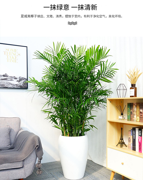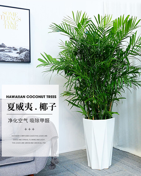 夏威夷椰子性喜高溫高濕,耐陰,怕陽光直射;對土壤適應(yīng)性強,但以疏松、濕潤、排水良好,土層深厚土壤為宜。不僅株姿優(yōu)美,且易開花結(jié)籽,外觀枝葉茂密、葉色濃綠,并富有光澤,羽片雅致,給人以端莊、文雅、清秀之美感,能長期擺放于室內(nèi),可花、果、葉、莖共賞,有利于凈化空氣,美化環(huán)境。