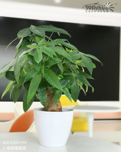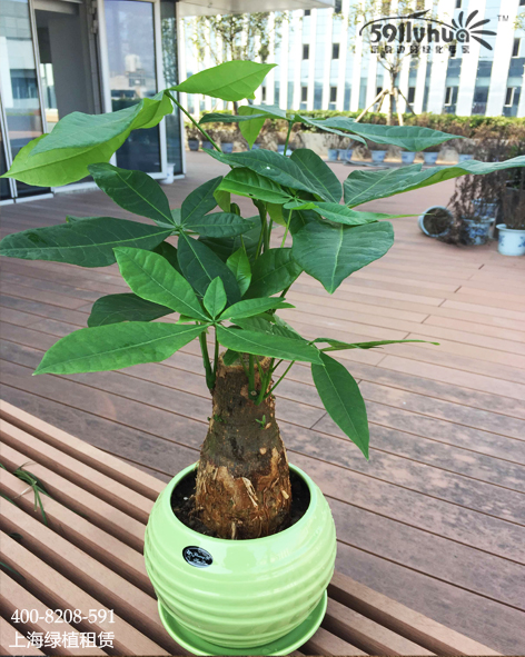 發(fā)財樹為常綠喬木,樹高可達10米左右。掌狀復葉互生,葉柄長10~28厘米;小葉5~9枚,葉長橢圓形、全緣,葉前端尖,長約10~22厘米,羽狀脈,小葉柄短?;▎紊谌~腋,有小苞片2~3枚,花朵淡黃色。寓意著“生意興隆,財源滾滾”。
